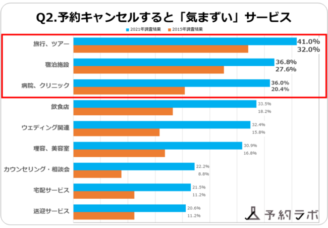 今回の調査と前回の調査を比較すると、「予約キャンセルをしやすいサービス」や「予約キャンセルをすると気まずいサービス」の順位に大きな相違はなく、「予約キャンセルをしやすいサービス」は「飲食店」「病院クリニック」「理容、美容室」、「予約キャンセルをすると気まずいサービス」は「旅行、ツアー」「宿泊施設」「病院クリニック」となりました。