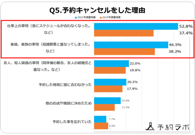 「予約キャンセルをした理由」は、前回37.4%で2位だった「仕事上の事情」が52.8%で1位となり、前回38.2%で1位だった「家庭、家族の事情」は46.5%で2位となりました。