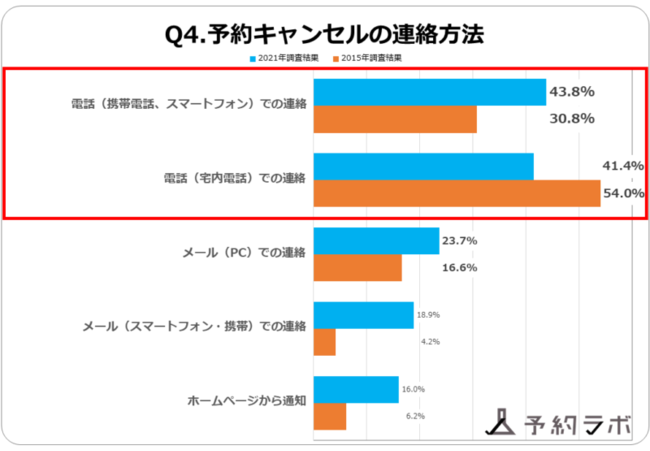 「予約キャンセルを行った際の連絡手段」は、前回の調査では2位で30.8%だった「電話(携帯電話、スマートフォン)での連絡」が43.8%となり1位に、そして前回5割を超えて1位だった「電話(宅内電話)での連絡」が41.4%となり2位となりました。