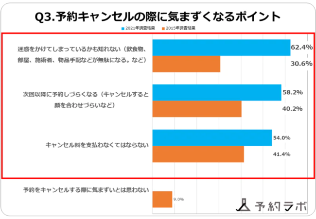 「予約キャンセルをする際に気まずくなるポイント」は、前回の調査では3位だった「迷惑をかけてしまっているかもしれない」が今回の調査では1位となり62.4%、2位が「次回以降に予約しづらくなる」で58.2%、3位が前回1位の「キャンセル料を支払わなくてはならない」で54.0%となりました。