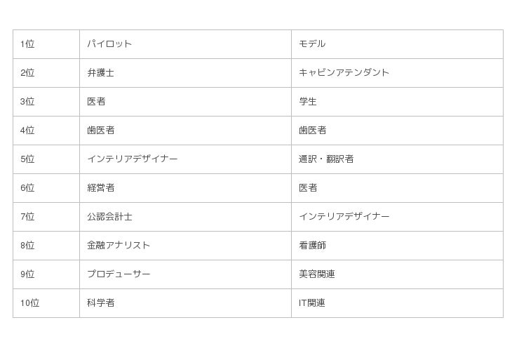 男性人気は「パイロット」「弁護士」、女性人気は「モデル」「CA」
