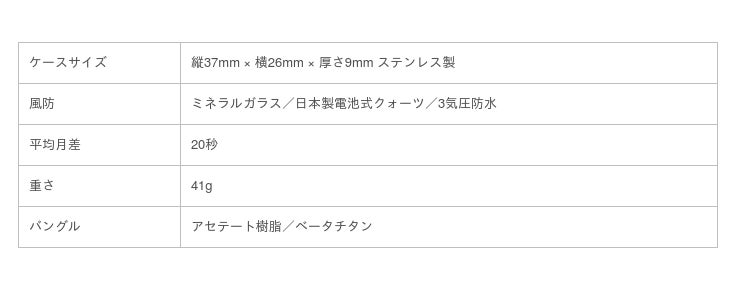 縦に長いスクエアの文字盤は横径をバングルと同じサイズに揃えることで、スーツやビジネスシーンに映える洗練されたクールな印象に。美しいカーブをつくるバングルは肌にやさしい自然素材のアセテートを使い、手首を曲げても邪魔にならず、しっかりしたホールド感でクルクル回ることはありません。文字盤とバングルは、それぞれスーツに似あう黒・茶・灰系の落ち着いた3色を展開し、自由に付け替えが可能。シックなトーンに統一しているので、どの組み合わせもお洒落に仕上がります。