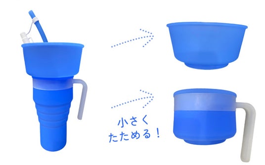 ドリンクカップ部分、通常時高さ23cmが折りたたむと6.6cmまで縮小が出来る。