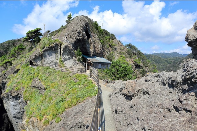 南伊豆町にある「石廊崎(いろうざき)」は絶景ポイントで、その岩山に食い込むように建っている「石室神社(いろうじんじゃ)」も名物の一つ。