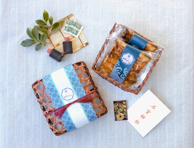 そう願って、女性や若者にも喜ばれるパッケージデザインと、「うなぎのかわはちくん」キャラクターを作りました。また、ギフトを購入いただいた方には、当店でご縁が広がるというご利益のあった、石室神社の5円玉守りをお福分けとしてプレゼントいたします。