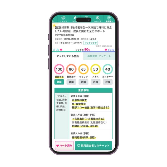 本サービスは獣医療従事者向けプラットフォーム「ベットピア」と連携し、業界特有のニーズに対応。求職者は選考開始までは匿名で利用できるため、在職中でも安心して転職活動を始めることができます。また、マッチング成立後はチャット機能が利用可能となり、求職者・病院双方が仲介者を介さずに直接やり取りできる仕組みを導入。事前の質問や条件確認を通じて、ミスマッチのないコミュニケーションを実現します。