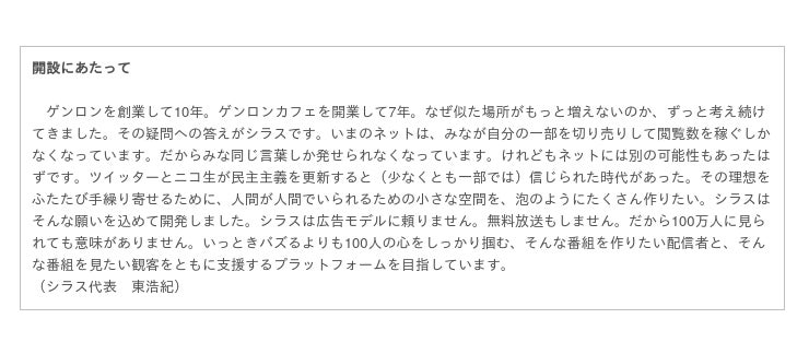 シラスは、株式会社ゲンロンの協力のもと、合同会社シラス(本社:東京都品川区、代表:東浩紀)が開発した放送プラットフォームです。合同会社シラスは株式会社ゲンロンのグループ企業です。株式会社ゲンロンは同日、シラス上で、ゲンロンカフェのイベントをすべて生放送する(※1)「ゲンロン完全中継チャンネル」を開設いたします。