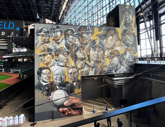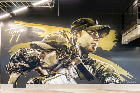 エスコンフィールドHOKKAIDOの開業にあわせてダルビッシュ有選手、大谷翔平選手を描いてから約1年。今年には、ファイターズが球団創立50周年を迎えたことを記念して、ファイターズの歴史を築いてきたレジェンド15人を描きました。作品に込めたのは「夢を追いかけよう!」という、子どもたちへのメッセージです。レジェンドたちは子どもの頃からの夢を諦めず、追いかけ続けた人たちです。作品を眼にした人々がファイターズのレジェンドたちのように夢を追いかけ、未来を切り拓いて欲しい。私たちのそんな願いを作品に込めています。