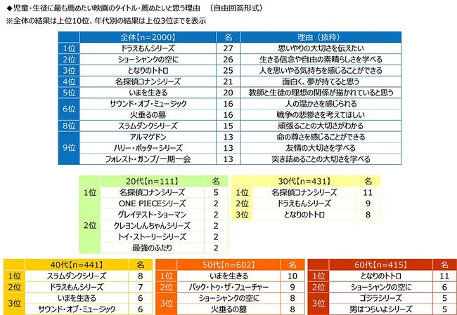 TOP3となった回答について、薦めたいと思う理由をみると、1位の「ドラえもんシリーズ」では「思いやりの大切さを伝えたい」、2位の「ショーシャンクの空に」では「生きる信念や自由の素晴らしさを学べる」、3位の「となりのトトロ」では「人を思いやる気持ちを感じることができる」といった回答がありました。