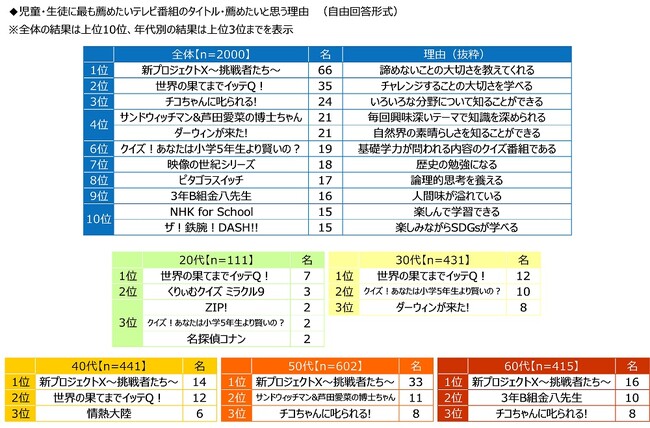 TOP3となった回答について、薦めたいと思う理由をみると、1位の「新プロジェクトX~挑戦者たち~」では「諦めないことの大切さを教えてくれる」、2位の「世界の果てまでイッテQ!」では「チャレンジすることの大切さを学べる」、3位の「チコちゃんに叱られる!」では「いろいろな分野について知ることができる」といった回答がありました。