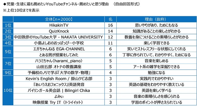 1位「HikakinTV」2位「QuizKnock」3位「中田敦彦のYouTube大学 - NAKATA UNIVERSITY」