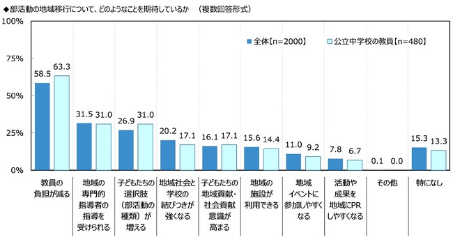 全回答者(2,000名)に、部活動の地域移行について、どのようなことを期待しているか聞いたところ、「教員の負担が減る」(58.5%)が突出して高くなりました。部活動の指導などに費やす時間が減り、教員の負担減少を図ることができると期待している人が多いようです。次いで高くなったのは、「地域の専門的指導者の指導を受けられる」(31.5%)、「子どもたちの選択肢(部活動の種類)が増える」(26.9%)でした。専門的な指導を受ける機会の創出や選択肢の増加など、子どもにとってのメリットを期待している人も多いことがわかりました。以降、「地域社会と学校の結びつきが強くなる」(20.2%)、「子どもたちの地域貢献・社会貢献意識が高まる」(16.1%)が続きました。