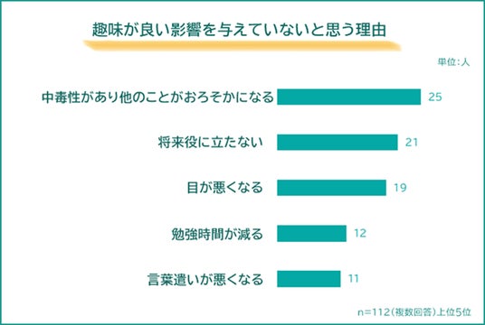 ただ「子どもの趣味に理解がある」と答えた人よりは割合が低くなっているのは気になるところ。「理解しているつもりだけど、正直なところ今の趣味が子どもにとって良いと思えない」と感じている人もいるとわかります。
