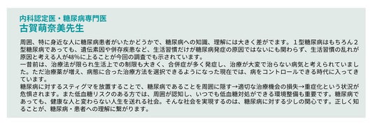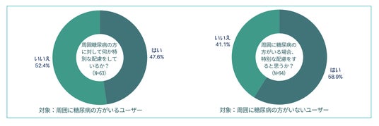 周囲に糖尿病がいないと回答した94名のうち、周囲にいた場合、特別な配慮すると考える人は58.9%でした。具体的な内容に関しては、体調の確認をすることと食事関連での配慮に関する回答が多くみられました。一方で、甘いものを渡さないようにする、外食に誘わない、生活習慣を正すようにいうといった糖尿病と診断されている方が誤解されていると感じたり、嫌な思いをした経験と合致するものも一部見られました。