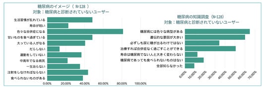 また、糖尿病と診断されていないユーザーに対し、糖尿病に関するイメージを聞いたところ、「色々な合併症になる(足を切る、目が見えなくなる、透析が必要になる)」が最も高く、81.25%でした。生活習慣に関する「生活習慣が乱れている」「甘いものを食べ過ぎている」がそれぞれ48.44%、続いて「注射をしなければならない」が43.75%の順に多い結果となりました。