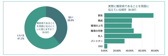 また、実際に周囲に糖尿病であることを打ち明けているかについては、16.4%が誰にも打ち明けていないと回答。打ち明けているひとの内訳としては、最も高い割合は77.8%の家族で、ついで友人が58.9%と半数以上が打ち明けていると回答しました。一方で職場での上司や同僚へ伝えている割合はそれぞれ43.32%、46.6%と半数以下であることがわかりました。