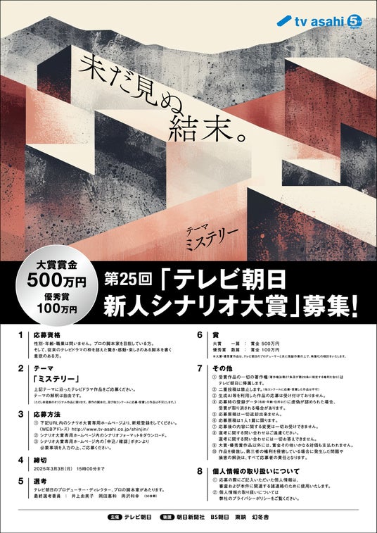 2007年7月に創設して以来、数多くのシナリオライターを輩出してきた「テレビ朝日新人シナリオ大賞」が今年も募集を開始。25回目となる今回は、「ミステリー」をテーマとしたテレビドラマ作品を募集いたします。