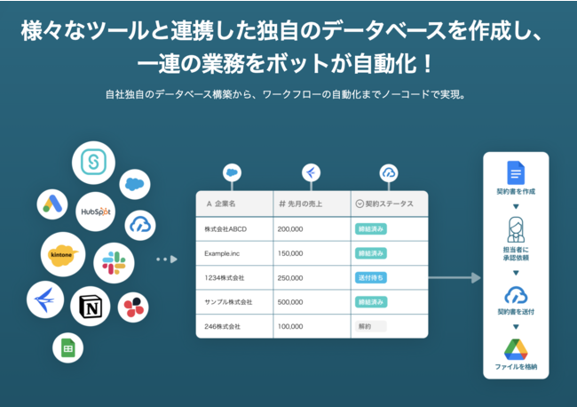 独自のデータベースを作成し、様々なツールと連携した一連のワークフローをボットが自動的に進行することで、セールス、人事、労務、経理など様々な部門の業務を自動化・効率化することが可能です。