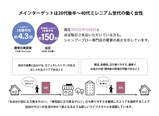 仕事と家庭の両立に毎日忙しい女性たちに向け、ジムやカフェに寄るような気持ちで「お出かけ前や帰宅前に気軽に立ち寄るサロン」として新たなライフスタイルを提案しています。