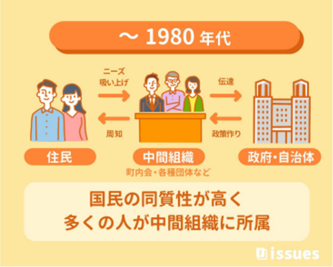 住民の声の集約にあたって、かつては町内会・自治会・業界団体・労働組合などの中間組織が大きな役割を果たしていました。