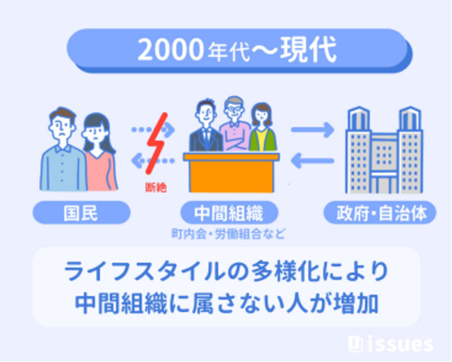 しかし2000年代頃からライフスタイルの多様化が進み、都市部の20~40代を中心に中間組織に属さない人が増加しまし た。例えば労働組合の組織率は高度経済成長期には35%ほどで推移していましたが、現在では17.1%(厚労省「労働組合基礎調査」2020年6月30日現在)まで低下しています。