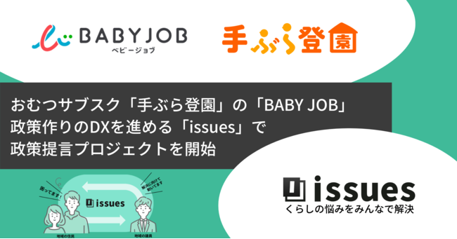 政策作りのDXを進める株式会社issues(代表取締役:廣田達宣 本社:東京都大田区)は、紙おむつのサブスク「手ぶら登園」を提供するBABY JOB株式会社(本社:大阪府大阪市、代表取締役 上野公嗣、以下BABY JOB)が、「issues ~くらしの悩みをみんなで解決」において政策提言プロジェクトを開始したことをお知らせいたします。