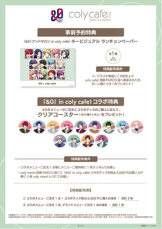・『coly more! 池袋PARCO店』にて、『&0』in coly cafe!コラボグッズを税込2,000円お買い上げ毎に1枚、『coly more! 池袋PARCO店』レジにてお渡し