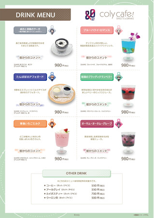 開催期間中、『coly cafe! 池袋PARCO店』でご覧いただけるメニュー表には、『&0』メインシナリオライターの三本恭子先生書き下ろしのメニュー紹介・歌舞輝町の彼らからのコメントの掲載を予定しております。