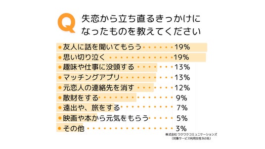 失恋から立ち直るきっかけには、「友人に話を聞いてもらう」「思い切り泣く」が上位に。また、失恋後の日々の過ごし方は、自分がしたい髪型や着たい服を着たり、今までは行けなかった場所にでかけたりなど、いつも以上に開放的になるとの回答が多数寄せられました。