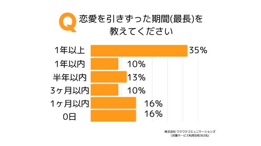 恋愛を引きずった最長期間について1年以上と答えた人が最も多く35%。反対に、切り替えが早く、1ヶ月以内やその日のうちに忘れるという人もあわせて32%ほどという結果に。