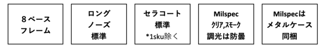 ANSIz87.1全面適合、更に最新MIL-PRF-32432A耐衝撃性まで持ち合わせた プロユースの上位機種も展開します。