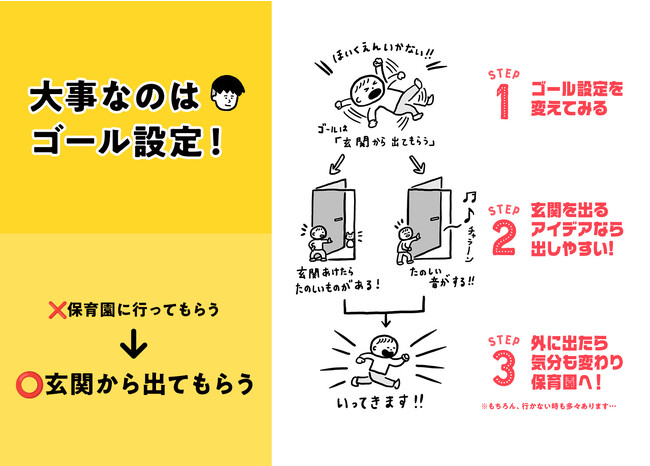 この場合「保育園に行く」というゴールを「玄関から外に出る」に変えることで、クリアハードルは大きく下がります。例えば、玄関に音が鳴る鈴をつけたり、玄関の外に何か楽しいものを配置することで、子どもを外に出してあげることはできます。