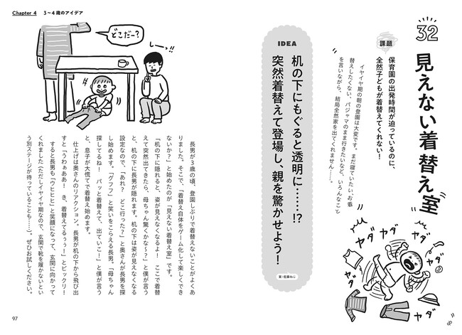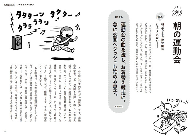 育児アイデアは、見開きにつき1ネタ。イラスト多めで、気楽に読める本です。