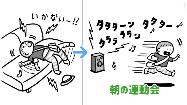 イヤイヤして保育園に行かないとき。うちの場合「運動会の曲」を流すと、なぜかテンション爆上がりして、玄関にきてくれました。