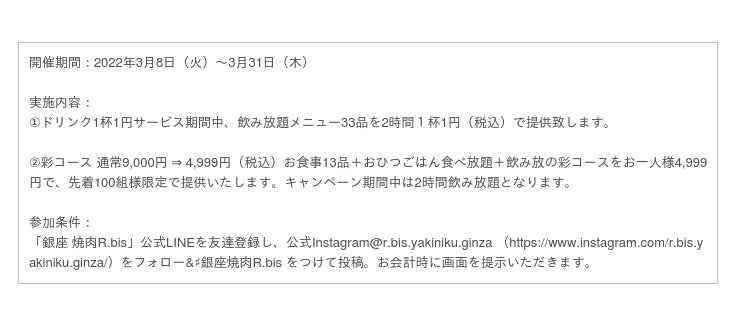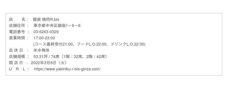 飲食店を展開するS.H.N.株式会社(本社:東京都渋谷区、代表取締役:高橋竜太)は、焼肉レストラン「銀座 焼肉R(あーる)」のセカンドブランドとして『銀座 焼肉R.bis(あーる・どっと・びす)』を3月8日(火)、オープンいたします。