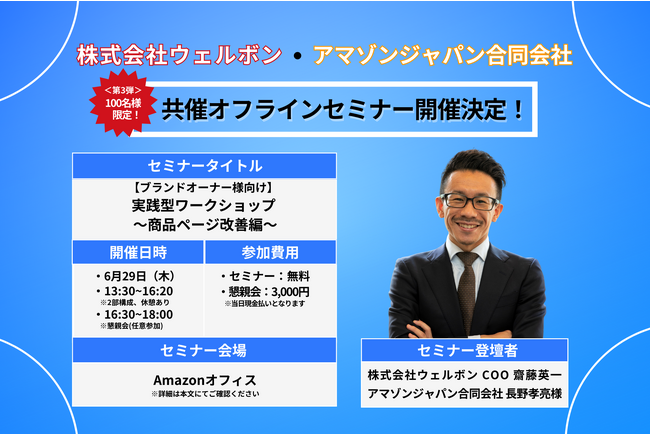 株式会社ウェルボンとアマゾンジャパン合同会社のコラボレーションによる、特別なオフラインセミナーが6月29日(木)13時30分に開催されます。ブランドオーナー様だけでなく、商品ページの改良に取り組みたい方々へ提供するワークショップ【実践型ワークショップ ~商品ページ改善編~】が注目のメインテーマとなります。