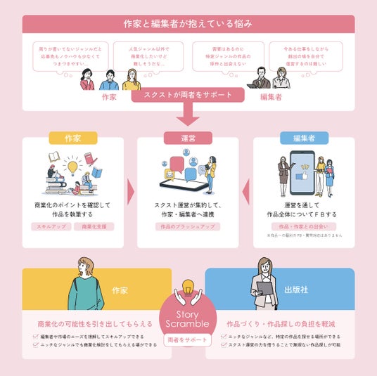 小説投稿サイトでは流行しているジャンル以外は、質が高くても読者や編集者の目に止まりにくいのが現状の課題です。『Story Scramble-ストスク-』では、出版社がニーズを発信して、そのニーズに応える形で作家が執筆を始めていくため「見つけられない」「見つけてもらえない」という両者の悩みを解決します。