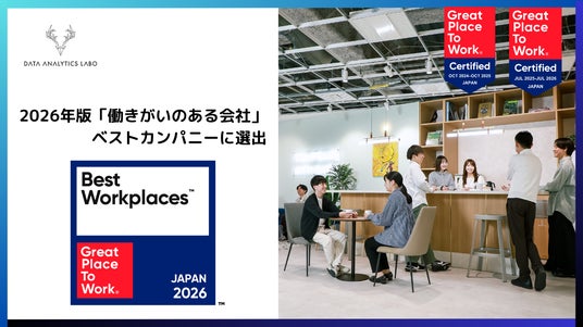 データアナリティクスラボ株式会社(本社:東京都、代表取締役:近藤雅彦)は、Great Place to Work(R) Institute Japan(以下、GPTW)が発表する「働きがいのある会社」2026年版 中規模部門において、ベストカンパニー100に選出されたことをお知らせいたします。