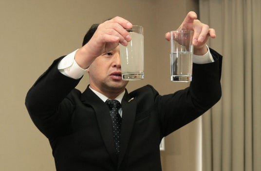 写真左:処理前の水(海水)、写真右:処理後の水(淡水)