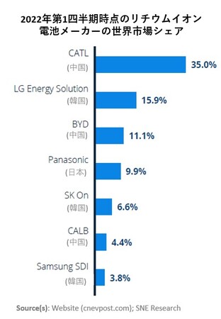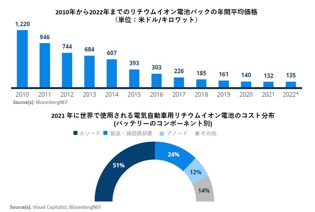 また、リチウムイオン電池の市場は、アジアのブランドが牽引しています。2022年第1四半期時点では、中国のCATLのシェアが市場の約35%を占め、また電気自動車メーカーで唯一、BYDがランクインしているなど、電池のサプライチェーンは不均衡なセグメントでありつつも、アジアが業界の生産とイノベーションの最前線となっています。