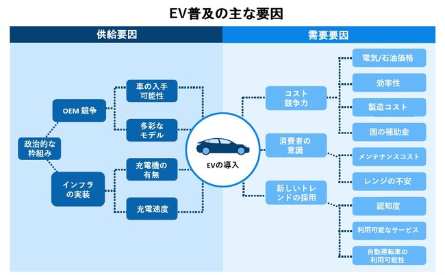 EVの普及は、需要と供給によって決まります。この市場に直接影響を与えるのは、政府、メーカー、消費者の3つのステークホルダーであり、これらはすべて本質的に関連しています。