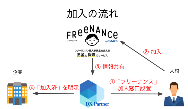 フリーランス向け金融支援サービス「FREENANCE byGMO」と連携し、DXパートナーを利用する副業・兼業人材に対する「反社チェック」「損害賠償保険(無料)への加入」などを実現することで、企業と人材双方がより「安心」してご利用いただくための環境を提供します。