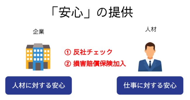 また、会員登録時には「本人確認」「反社チェック」を行なっており、企業と人材に対する「安心」を提供しています。