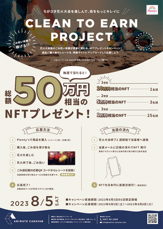 2023年 8月 3日、ネイティブキャラバン株式会社(代表取締役:滝島 大介、本社:神奈川県茅ヶ崎市、以下「当社」と言います。)は、茅ヶ崎の人気アイスクリーム店「Plenty's」や地元クリエイターの甘粕ジョージと協力し、2023年 8月 5日(土)開催の「サザンビーチちがさき花火大会」に向けて、ゴミ拾い体験を資産に変える「Clean to Earn」をリリースしたことをご報告いたします。