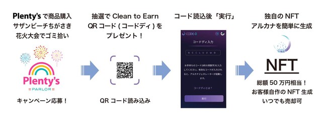 抽選で28名/総額50万円相当にNFT生成権をお送りします。また、駅前や店舗内でキャンペーンページにアクセスするためのゴミ袋を1,000枚配布予定です。キャンペーンにご興味が無い方でも、ゴミ袋としてご利用可能となります。