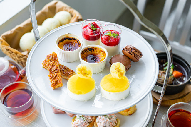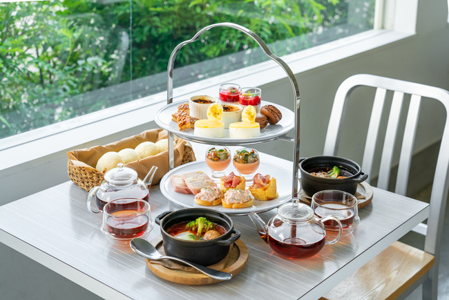 様々なオリジナルスイーツやセイボリーが並んだ2段のアフタヌーンティースタンドをはじめ、フランス・パリの老舗紅茶ブランド「マリアージュフレール」より厳選した3種から選べる紅茶をティーポットでご提供。さらに当店の看板メニューである「つけパンシチュー」も含めた、ランチも兼ねてお楽しみいただける充実のコース内容となっております。