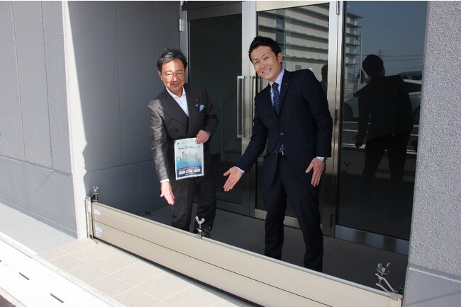 「今回あま市役所の新庁舎が、本社から目と鼻の先に建設されるという事で、是非地元に貢献したいという思いから、寄付の申し出をさせていただきました。庁舎自体、土地のかさ上げなど十分な水害対策を講じた設計と聞いておりますし、近年はポンプ・排水機場など周辺の水害対策の整備も進み、よほどの水害が発生しない限り、庁舎が罹災する可能性は低いという認識ではありますが、当地区は海抜ゼロメートル地帯でもあり、歴史的にも伊勢湾台風を始めとして多くの水害に悩まされてきた地域です。想定外・万が一の際は、非常に有効な製品でありますし、また普段においても防災訓練など市役所職員・市民の意識向上を目的にご活用いただければ幸いと考えております。」