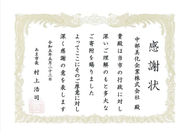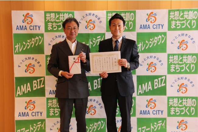 写真左から、あま市 村上市長、中部美化企業(株)笹野