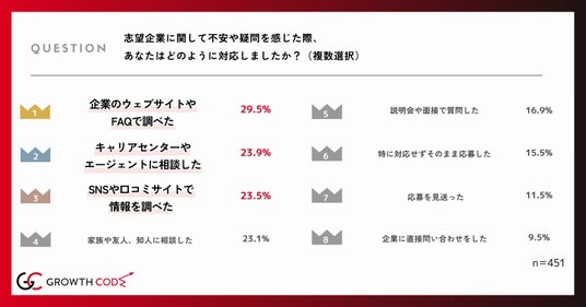 最も多かった回答は「企業のウェブサイトやFAQで調べた」で29.5%でした。次いで「キャリアセンターやエージェントに相談した」(24.0%)、「SNSや口コミサイトで情報を調べた」(23.5%)、「家族や友人、知人に相談した」(23.1%)と続きます。