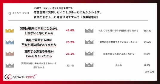 最も多かった回答は「質問が採用に不利になるかもしれないと感じたから」で、49.8%の回答者がこの理由を挙げています。つまり、約半数の求職者が質問すること自体に不安を感じていることがわかります。